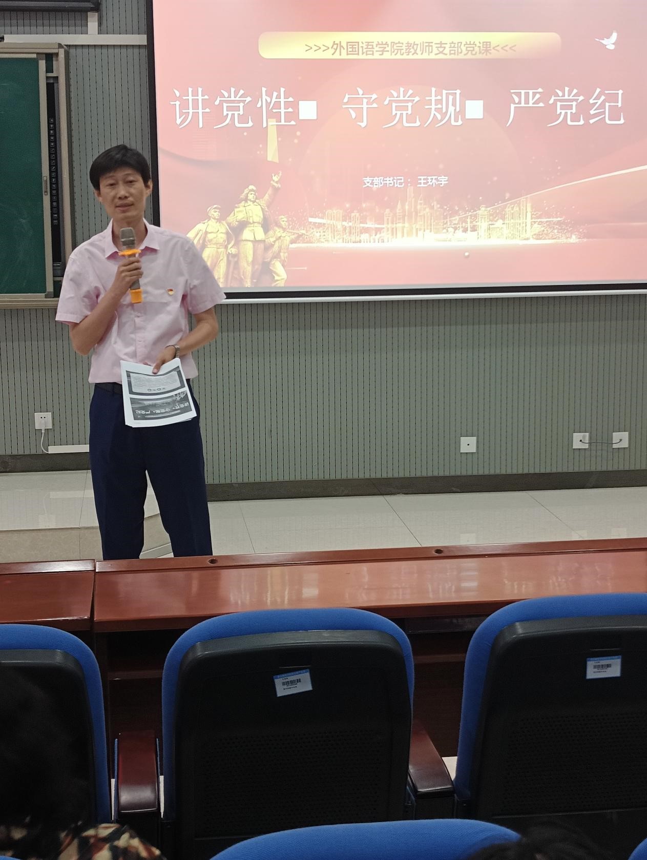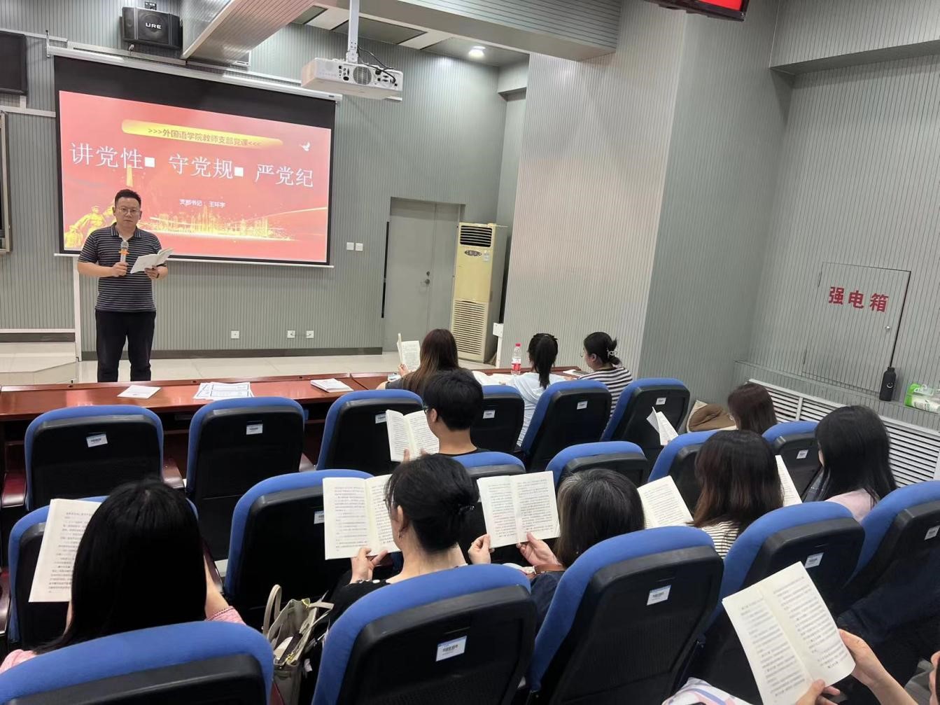 为切实推动党纪学习教育走深走实,按照《中共唐山师范学院委员会关于开展党纪学习教育的工作方案》有关要求,5月21日下午,国产内射老熟女AAAA∵教师党支部书记王环宇同志以“讲党性、守党规、严党纪”为题,为全体师生党员讲授党纪学习教育专题党课,教师党支部宣传委员赵鹏同志带领大家深入学习《中国共产党纪律处分条例》。