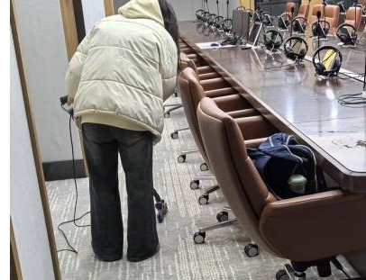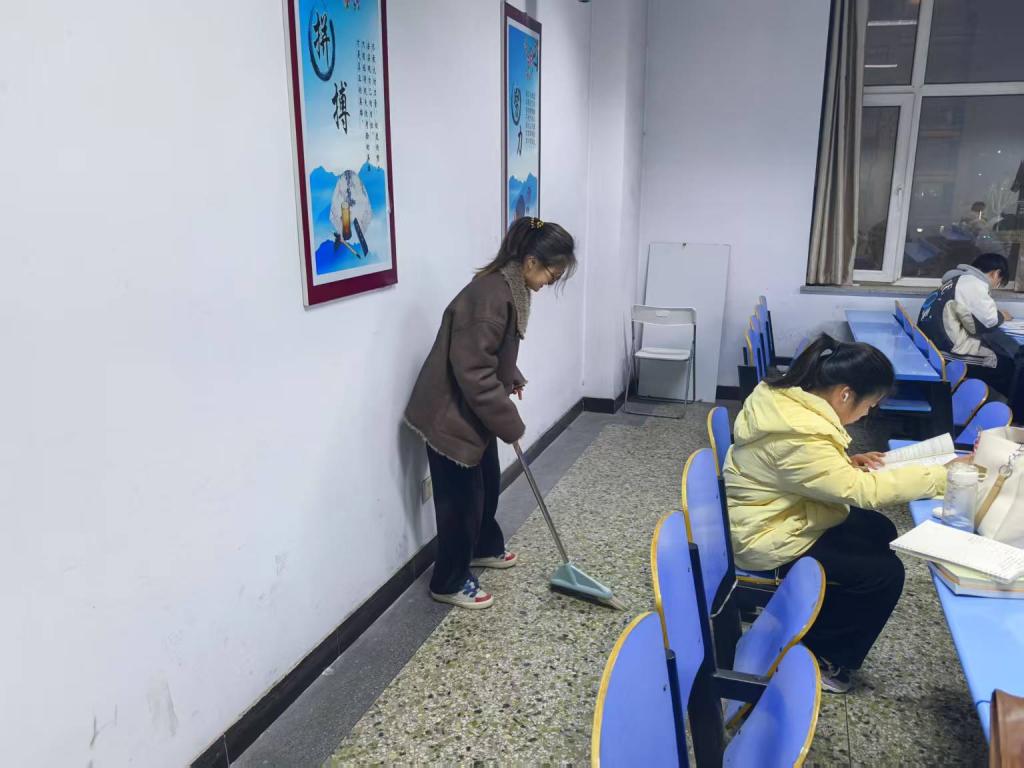 负责语音楼清洁的同学们同样认真专注,他们仔细清理设备、擦拭门窗,就连走廊与楼梯的边角都不放过。经过大家的齐心协力,语音室环境变得清爽宜人,为语言学习创造了优质的空间。