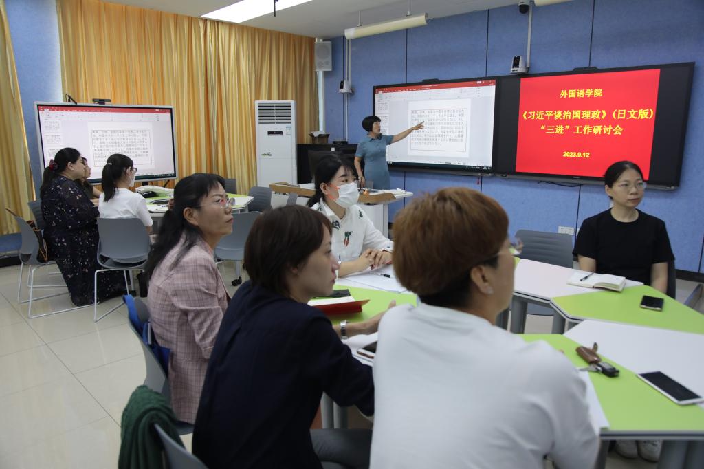 为进一步推进“三进”工作向纵深发展,增强我院全体教师的政治敏锐性和业务水准,改革创新教学形式,盘活外语专业思政教学资源,国产内射老熟女AAAA∵于9月12日下午在晶博楼智慧教室和未来教室召开《习近平谈治国理政》(英日德文版)“三进”工作研讨会。研讨会由各教研室主任主持,我院全体教师参加。