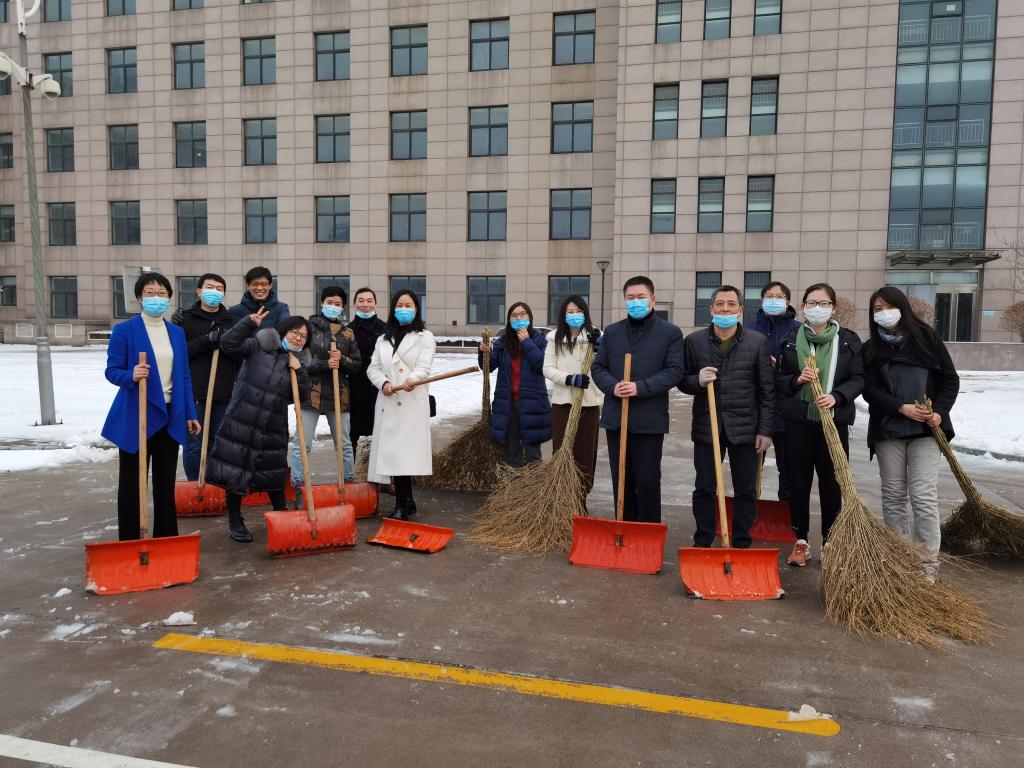 教师们拿着雪橇、扫帚等劳动工具到北院停车场集合,天气虽冷,但教师们义务奉献的热情十分高涨。教师们先用雪橇铲雪块,接着用扫帚清扫残余积雪,分工明确、齐心协力,劳动有条不紊地进行。最难清理的是积雪下面的冰层,牢固地粘在地面上,很难撬动。虽然手被冻红了,头发也被汗水打湿了,但大家心里暖暖的。经过大家的共同努力,积雪和冰层全部清理完毕,保障了车辆和行人的出入安全。