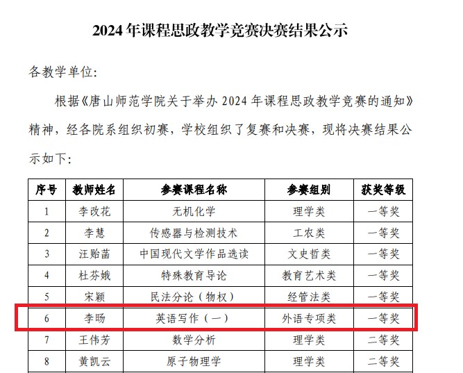 7月6日,在全校课程思政教学竞赛中,我院李旸老师凭借扎实的理论功底、创新的教学方法和出色的教学展示,获得唐山师范学院课程思政教学竞赛外语专项类一等奖。